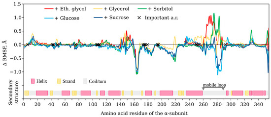 The change in the root-mean-square fluctuation (RMSF) of luciferase Cα-atoms was analyzed. We calculated ΔRMSF = RMSFcos − RMSFwater, where RMSFcos and RMSFwater were parameters in the presence and absence of a cosolvent, respectively. The most pronounced effects were obtained for the 140–300 a.r. range of the catalytic α-subunit of luciferase (Figure 8). All cosolvents decreased RMSF in the 160–170 a.r. range (ΔRMSF < 0). However, the functional role of this segment is not clear yet. The influence of the cosolvents on the dynamics of the functionally important mobile loop (261–290 a.r.) could also be seen. The polyhydric alcohols tended to increase the mobility of this loop (ΔRMSF > 0), while saccharides had the opposite effect (ΔRMSF < 0).