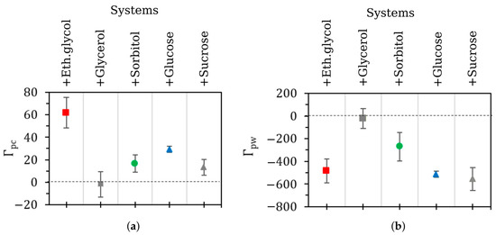 Using MD-trajectories, we calculated the minimum-distance distribution function (MDDF) of cosolvent and water molecules relative to luciferase surface [29] in order to estimate the corresponding preferential interaction coefficients Γ (Figure 9). Γ > 0 means that concentration of the molecules near the protein surface is higher than in bulk solution and, vice versa, Γ < 0 refers to the case when the molecules are excluded from the protein surface [30]. The data shown in Figure 9 indicate that, for the majority of the cosolvents, the preferential binding with luciferase surface was observed. Water molecules were excluded from the surface, which was most pronounced in the treatments with ethylene glycol, glucose, and sucrose.