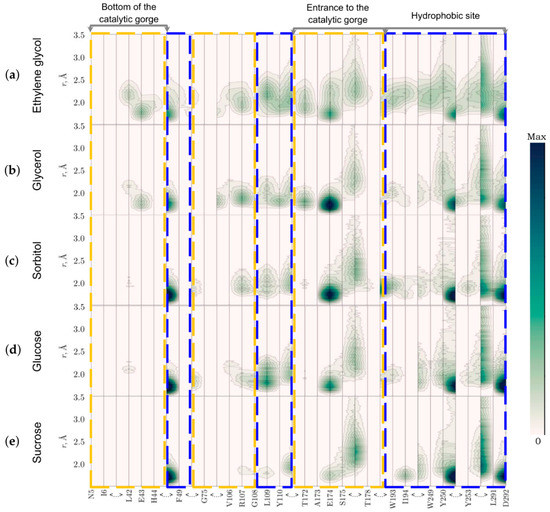 The distribution of the cosolvent molecules within the first hydration shell of the active site of luciferase was analyzed in terms of two-dimensional MDDF maps (Figure 10). It was revealed that only ethylene glycol and glycerol could reach the bottom of the catalytic gorge of luciferase and locate at a distance of <2 Å from the Glu43. Generally, we found that the smaller cosolvent molecule, the higher the probability of its location near the flavin binding site (for example near Arg107), even if the amino acid is at the entrance to the catalytic gorge (Glu174). However, the interaction with hydrophobic site was more probable for larger molecules such as sorbitol, glucose, and sucrose (Phe49, Tyr250). Leu291 and Asp292, which are adjacent to the luciferase mobile loop segment, had a close contact with larger cosolvent molecules as well.