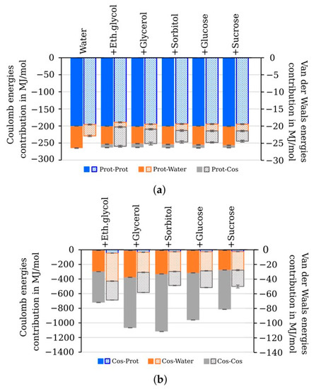 Additionally, we calculated nonbonded interaction energies between the components of the studied systems (protein, water, and cosolvent molecules). The major contribution to the Coulomb interaction energies of luciferase was made by intraprotein interactions, while the cosolvents partially replaced water molecules interacting with the protein without substantial changes in the total Coulomb energy (Figure 11a, filled bars). At the same time, the total van der Waals interaction energy of the studied systems was slightly enhanced in the presence of the cosolvents due to protein–cosolvent interaction (Figure 11a, dashed bars). In addition, it was revealed that intraprotein van der Waals interactions became lower in the presence of ethylene glycol (18.87 ± 0.17 MJ/mol) compared with the water environment (19.51 ± 0.16 MJ/mol). That was consistent with the higher Rg and SASA values, which indicated less compact protein structure than in the other modeled systems (Figure 7e,f). For cosolvent molecules, the main contributions to the nonbonded interaction energy were made by Coulomb interaction within the cosolvent–water and cosolvent–cosolvent groups. In Figure 11b, the energies of protein–cosolvent interactions can barely be seen compared with those energies. Of all cosolvents, ethylene glycol demonstrated the highest energy of van der Waals interactions and the lowest energy of Coulomb interactions.