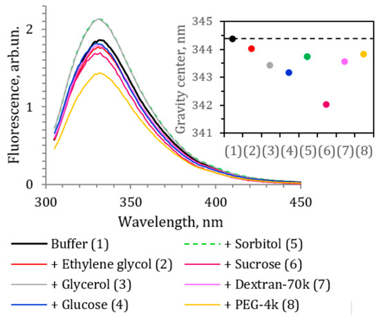Structural changes in bacterial luciferase in the presence of cosolvents or intermolecular interaction of the cosolvents and protein surface could be detected by fluorescence spectroscopy technique. The luciferase molecule contains seven tryptophan residues and under excitation at 270–290 nm demonstrates pronounced fluorescent signal, which is quite sensitive to the protein microenvironment and structural changes [26]. We measured the fluorescence spectra of the luciferase in the presence of maximum concentrations of the cosolvents to detect the direct cosolvent–protein interactions or perturbation of the tertiary structure of the protein. Excitation at 295 nm was used, and, thus, tryptophan residues were the major fluorophores of the protein. Figure 12 demonstrates the obtained spectra of luciferase and the position of their gravity center. The cosolvents shifted the fluorescence spectrum to the shorter wavelength. That hypsochromic shift was most pronounced for the sucrose solution (by 2.4 nm), while ethylene glycol had the weakest effect (by 0.3 nm). Additionally, the increase in fluorescence intensity was observed for glycerol and sorbitol solutions, and the decrease for the polyethylene glycol solution. The results indicated that tryptophan residues of luciferase moved to a less polar environment in the presence of the cosolvents, and no sign of protein denaturation (which makes tryptophans more accessible for water) was observed. We incubated luciferase in cosolvent solutions overnight and then repeated spectral measurements, which did not show any change in protein fluorescence spectra compared to the spectra demonstrated in Figure 12. Thus, we excluded the slow denaturation of the protein in the presence of cosolvents as a mechanism of the effects of the media on the luciferase reaction rate.