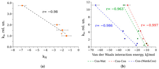 (a) Correlation plot between catalytic constant k4 of bacterial luciferase in solutions with water activity about 0.98 (ethylene glycol 10 wt %, glycerol 10 wt %, sorbitol 20 wt %, glucose 20 wt %, and sucrose 30 wt %) and Norrish constant kN of the cosolvents used. The Norrish constants were calculated as mean ± standard deviation using the literature data [41]; (b) correlation plot between catalytic constant k4 of bacterial luciferase in solutions with maximum cosolvent contents (ethylene glycol 30 wt %, glycerol 40 wt %, sorbitol 40 wt %, glucose 40 wt %, sucrose 40 wt %) and van der Waals interaction energies of the cosolvent with water (Cos-Wat, green markers) and itself (Cos-Cos, red markers), as well as the sum of these energies (Cos-(Wat&Cos), blue markers). The energies are calculated per one cosolvent molecule as mean ± standard deviation of three independent runs. The coefficients of linear correlations r are indicated. Dashed lines are linear approximations of the data. Cosolvent markers: ethylene glycol—cross, glycerol—square, sorbitol—circle, glucose—triangle, and sucrose—diamond.
