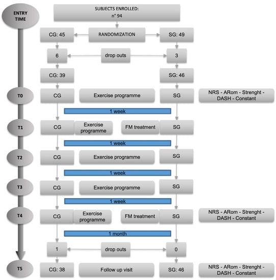 The NRS, aROM, and strength outcome assessments were carried out at recruitment (T0), before (T1) and after (T2) the second session, before (T3) and after (T4) the fifth session, and at follow-up (T5) one month after the latter. Functionality and disability outcomes measured by the DASH and Constant Murley scale were measured at T0, T4, and T5.