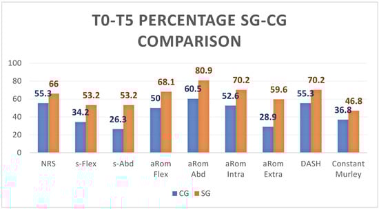 The graph in Figure 2 shows the percentage of the difference between T0–T5 for all the outcomes for CG and SG. SG improved more than CG in every outcome.