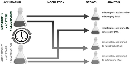 Cultures of Chlamydomonas reinhardtii P.A. Dangeard 1888 CC-124 were kindly donated by Dr. E.M. Chekunova, Department of Genetics and Biotechnology, Faculty of Biology, St. Petersburg State University. Axenic cultures were maintained under mixotrophic conditions on TAP (Tris–Acetate–Phosphate) medium [27] or autotrophic conditions on TM (Tris Minimal, without acetate) medium in half-filled 500 mL cone glass flasks, corked with cotton stoppers. The cultures were grown under constant illumination with fluorescent lamps with an intensity of 42 µmol m−2 s−1 photons PAR. To determine the effect of acclimation (Figure 1), autotrophic (AA), and mixotrophic (MM) cultures were maintained in this mode for at least a year, which caused acclimation to these trophic conditions. Furthermore, some of these cultures were transferred to other nutritional conditions (i.e., cultures acclimated to autotrophy—to mixotrophic (AM) or mixotrophic—to autotrophic (MA)). The initial cell density was equalized. Three independently grown cultures corresponded to three biological replications. Samples were taken four times during culture development. At the beginning of exponential growth (first DAI (day after inoculation) for mixotrophic, third DAI for autotrophic), its middle (second DAI for mixotrophic, sixth DAI for autotrophic), the second half—completion of exponential growth (fourth DAI for mixotrophic and twelfth DAI for autotrophic), and in the stationary phase (sixth DAI for mixotrophic and twentieth DAI for autotrophic).