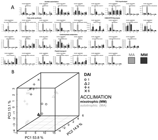 Expression profiles of the genes coding the enzymes of central metabolism and plastid transporters in C. reinhardtii mixotrophic cultures acclimated to mixotrophy (MM) or autotrophy (MA). (A) Relative gene expression; intervals—SD; abscissa—DAI (day after inoculation). (B) Score plot from the PCA of the expression profiles.