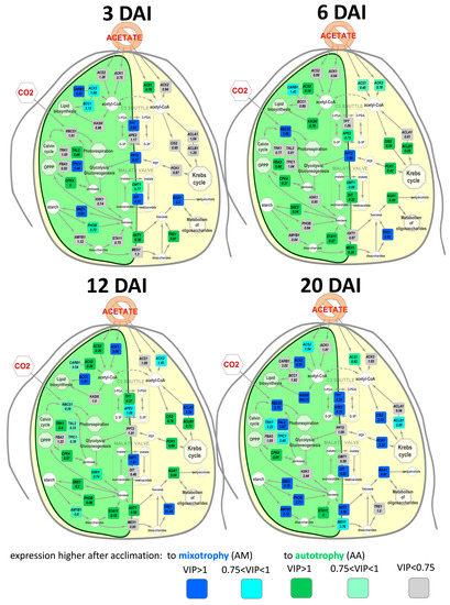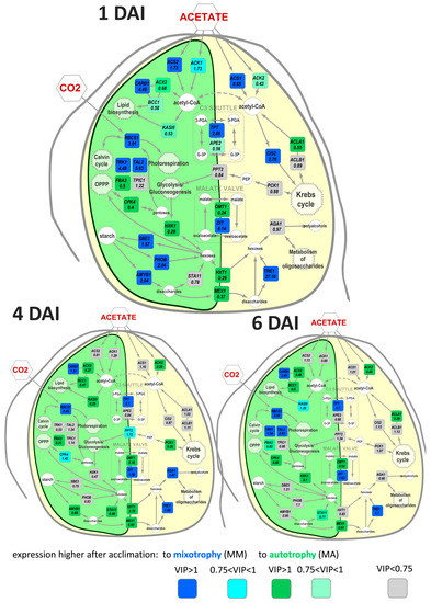 OPLS-DA models were made for each of the studied time points. The parameters of the models are given in Table 1. An essential part of variance associated with the predictive component was observed at the end of the exponential and in the stationary phase. The effect of acclimation on autotrophy at different DAIs is demonstrated in Figure 7.
