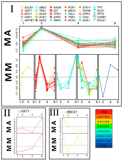 Comparative analysis of the patterns of the gene expression dynamics in mixotrophic cultures of C. reinhardtii. The genes were divided into three groups (I–III) as a result of PCA with distance measured as the Pearson correlation of the expression levels in the mixotrophic cultures acclimated to autotrophy (MA). For comparison, the dynamics patterns of the same genes in mixotrophic cultures acclimated to mixotrophy (MM) are presented (also clustered by the expression dynamics). Colors mark the level of correlation between MM and MA cultures. The data on the graphs are standardized. Abscissa—day after inoculation.
