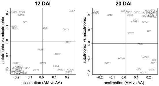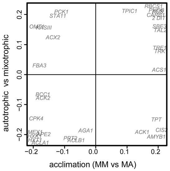 The next step of our study was to analyze, to what degree, the differences in mixotrophic cells, acclimated to autotrophy, were the result of the acquisition of trophic specialization after previous autotrophic cultivation. For this purpose, a SUS plot was created (Figure 5): scattering of genes in the space of loadings of predictive components from OPLS-DA for the comparison of MM and MA on the first DAI (abscissa) and auto and mixotrophic cultures during the beginning of exponential growth (first day for MM and third for AA). A significant number (22 out of 32) of genes had the same signs of loading, which significantly differed from randomness (p = 0.025). The correlation in loadings was reliable (rho = 0.43, p = 0.015), but not strong. At the later stages, this correlation disappeared. It is assumed that even after the transition to mixotrophy, at least at the initial stage of cultivation, the metabolic traits of autotrophic cultures remained.
