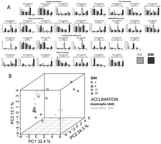 Expression profiles of genes encoding enzymes of central metabolism and plastid transporters in C. reinhardtii autotrophic cultures acclimated to mixotrophy (AM) or autotrophy (AA). (A) Relative expression, intervals—SD; abscissa—DAI (day after inoculation). (B) Score plot from PCA of expression profiles.