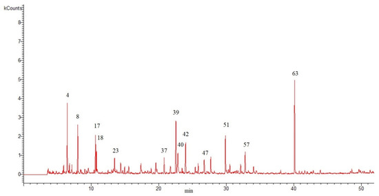 The identification of the separated essential oil components was accomplished by comparing their calculated retention indices (RIs) with the (C8-C20) n-alkanes values with a column of identical polarity and under the same chromatographic conditions, as well as matching their recorded mass spectra with those listed in the built-in libraries’ spectra (NIST, Gaithersburg, MD, USA and Wiley Co., Hoboken, NJ, USA). The principal components of the extracts were further identified by injecting authentic standard reference compounds under the same chromatographic conditions.