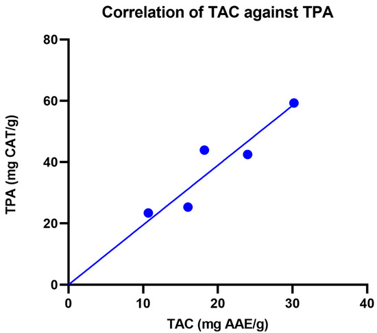 Correlation graph of TAC versus TPA of fractions A to E eluded from M. pumilum DCM leaf extract.
