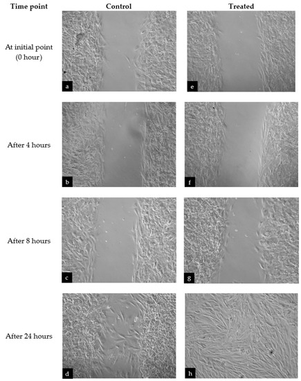 A sample of normal fibroblast cell migration images taken at different time points to compare between (a–d) the negative control and (e–h) cells treated with Fraction E of M. pumilum. All fractions displayed similar migration images and, thus, the pictures of Fraction-E-treated cells were selected to represent the fibroblast migration of all fraction-treated cells observed at different time points.
