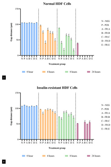 Gap distance of (a) normal HDF cells and (b) insulin-resistant HDF cells of different treatment groups from the in vitro scratch wound assay. One-way ANOVA statistical comparison is represented by letters ‘a’ as p < 0.05 and ‘d’ as p < 0.0001 against the negative group of the respective time points. NEG—negative control; POS—positive control; FR. A up to FR. E—fractions A to E.