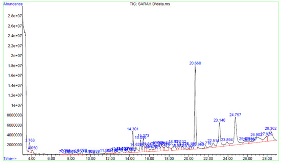Fractions A and E were further subjected to identify the major compounds present in each of these fractions, as the antioxidant and fibroblast migration activities of these fractions were the strongest among all the fractions. In Fraction A, 29 compounds were identified, as shown in Table 4, with their different retention times, as shown in Figure 4.