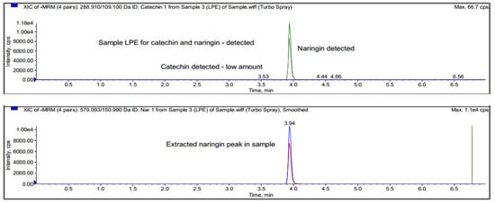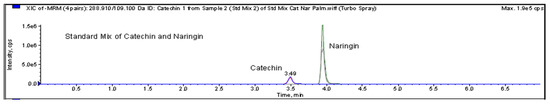 On the other hand, the HPTLC and LC-MS/MRM results revealed naringin as the major compound in Fraction E, while catechin was detected in trace amounts, as shown in Figure 5 and Figure 6.