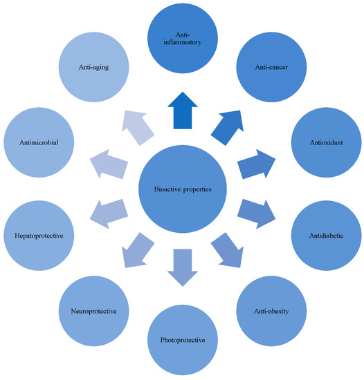 The bioactive compounds isolated from cyanobacteria consist of compounds with anti-inflammatory [7], anti-cancer [8], anti-bacterial [9], anti-parasitic [10], anti-diabetic [11], anti-viral [12], antioxidant [13], anti-aging [14,15], anti-obesity [16], hepatoprotective [17], immunomodulatory [18], photoprotective [19], and neuroprotective [20] activities [2]. So far, more than 2000 secondary metabolites have been identified from cyanobacteria, including marine cyanobacteria species like Moorea, Lyngbya, and Okeania spp. [21].