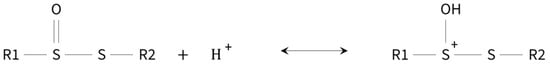 As noted previously, in acid media, the thiosulfinates can undergo protonation at the oxygen located on the sulfinyl sulfur atom, giving rise to an equilibrium that involves the generation of an electrophilic center and the partial destruction of the thiosulfinate [38], following the equilibrium represented in Figure 2. Therefore, a shift in the pH value of the media influences the concentration of thiosulfinates.
