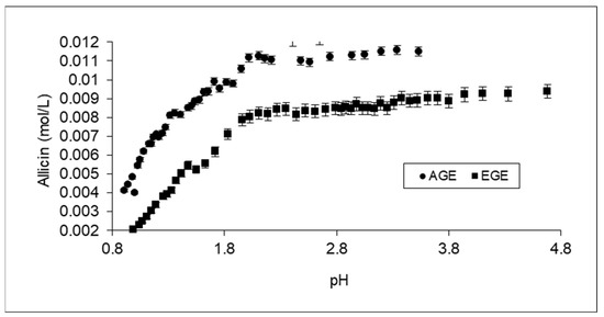 Evolution of the concentration of allicin against pH for EGE and AGE upon the addition of 1.03 N HCl.