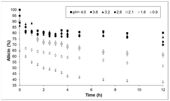 As expected, a decrease in allicin concentration was observed with time in all tests. This behavior was due to the occurrence of both protonation reactions in the acid media, as reported in Section 3.2, and thermal and oxidative degradation [26]. A marked decrease in thiosulfinate concentration was observed in a relatively short period of time at pH values below 2.0; this decrease occurred increasingly sharply with a further decrease in pH (blank dots in Figure 4). However, samples at pH values above 2.0 retained more than 70% of their original thiosulfinate concentration for 12 h. Analogous results were found for the other thiosulfinates analyzed in AGE and for the corresponding EGE extracts. The decrease of concentration observed for pH values lower than 2 clearly indicates that this limit should be considered when determining the formulation and dosage of a natural remedy using these selected extracts.