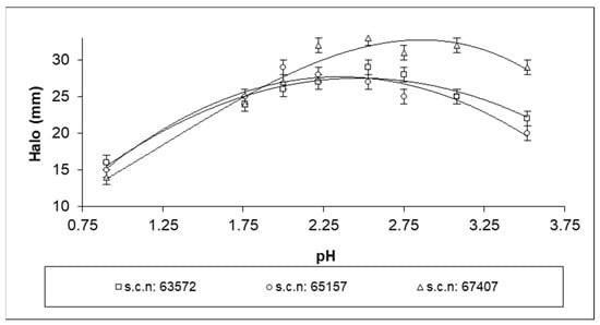 Figure 5 shows the diameters of the inhibition halos produced by samples of AGE at the studied pH values for three different strains of Hp. The strain clinical registration numbers are indicated in the legend of this figure. The diameters of the inhibition halos showed maximum values at pH 2.3–2.8 (mean 2.5), i.e., 28.94 ± 0.61 mm S.D. This result may have been due to the higher stability of thiosulfinate concentration over pH 2.0, as reported in the previous section.