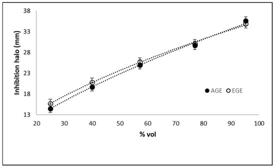 Considering that inhibition halos smaller than 10 mm are not significant according to microbiological criteria, from the data in Figure 6, the minimum inhibition concentration (MIC), corresponding to the minimal allicin concentration in the extracts required to produce inhibition activity, can also be determined. This MIC was a key parameter in the formulation of the dosage in the subsequent clinical testing of this alternative therapy. The MICs determined for AGE and EGE were: