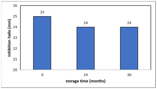 Storage stability of EGE samples. Inhibition Haloes after 2 years at pH 2.5 and 37 °C.