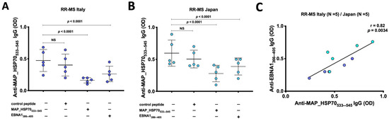 Inhibition ELISA assay. (A) Five sera from Italian RR-MS patients and (B) 5 sera from Japanese RR-MS patients were pre-incubated overnight with saturating concentrations of MAP_HSP70533–545, EBNA1386–405, or control peptide. After the incubation, the samples were added to plates coated with MAPHSP70533–545 peptide and subjected to indirect ELISA. The comparison of inhibition rates was calculated using Bland–Altman method. The results presented are representative of two separate experiments. (C) Correlation analysis between the titers of anti-EBNA1366–345 antibodies and the titers of anti-MAP_HSP70533–545 antibodies detected by peptide-based ELISA.