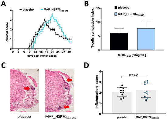 Effect of immunization with MAP_HSP70533–545 on active EAE. (A) Clinical score and course of the disease in C57BL/6J wild-type mice immunized subcutaneously with MAP_HSP70533–545 or placebo two weeks prior to EAE induction by MOG35–55. (B) T-cells isolated from the spleen were cultured with MOG35–55 peptide, the T-cell response was assessed by measuring [3H] thymidine incorporation at 48 h and analyzed at 56 h. (C) Spinal cord sections (4× magnification) were stained with hematoxylin/eosin during the peak of disease. (D) The inflammation index was calculated based on at least two sections per mouse. The data represent the combined results of three independent experiments with 10 mice per group. Data are expressed as mean ± standard deviation calculated using analysis of variance (ANOVA) followed by Dunnett’s post-hoc multiple comparison test.