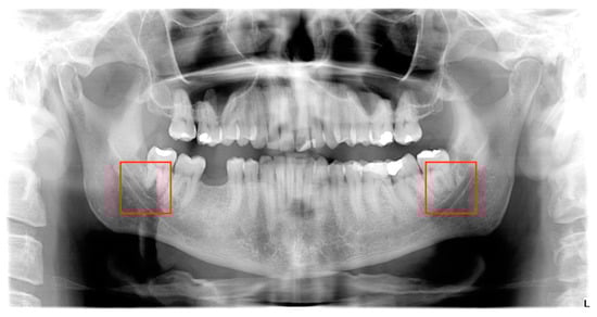 A panoramic radiograph with two red boxes designating the regions of interest (ROI). A location close to the canal and molar was chosen for the ROI’s center. The 2137 × 1024 pixel panoramic image was cropped to 224 × 224 pixels.