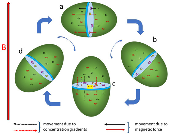 Assume an ellipsoid organism is divided into two compartments by a midline membrane permeable to cations and anions through ion-specific channels (Figure 1). Further assume that the organism is free-floating in a medium such as an aqueous environment that erratically causes the organism to tumble through cycles of rotation through both perpendicular and parallel orientations relative to the magnetic force field. When momentarily oriented with the organism’s long axis perpendicular to the magnetic force field, cations will be driven to the right and anions will be drawn to the left (Figure 1a). This leads to an excess of cations in the right compartment and anions in the left compartment.