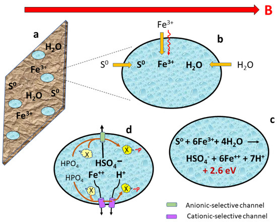 Assume oval-shaped organisms are living on a ferromagnetic substrate with the abundant availability of molecular sulfur, iron compounds, and water (Figure 2a). The organisms orient with ion-selective channels facing toward or away from (perpendicular to) a strong magnetic field (Figure 2b). Molecular sulfur, ferric ions (Fe3+) from iron-bearing minerals, and water are engulfed, ingested, or absorbed from the substrate into the organism. A role of the Lorentz force propulsion of charged particles such as ferric ions could also be to promote influx. An exothermic reaction occurs in which sulfur is oxidized and ferric ions are reduced, yielding energy that can be used for various metabolic, biosynthetic, and kinetic processes (Figure 2c). Negatively charged bisulfate ions are drawn through selective anionic channels, and ferrous (but not ferric) ions are pushed through selective cationic channels by the magnetic force field. This movement of ions through their respective selective channels engages molecular machinery that adds a high-energy phosphate bond to yield an energy-bearing molecule (Figure 2d), adding to the bioenergetic inventory along with the energy resulting from the redox reaction that generated the ions in Figure 2c.