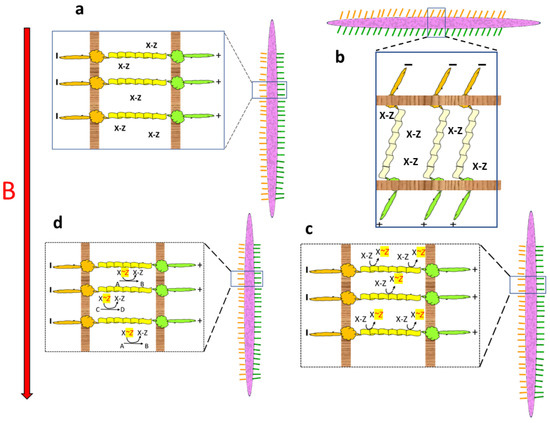 When the organism resumes an orientation parallel to the magnetic field, the elastic bands recoil to their unstretched conformation. The tensile energy thus released is coupled to the formation of high-energy bonds in energy-rich carrier molecules (X~Z) within the intercellular space (Figure 3c).