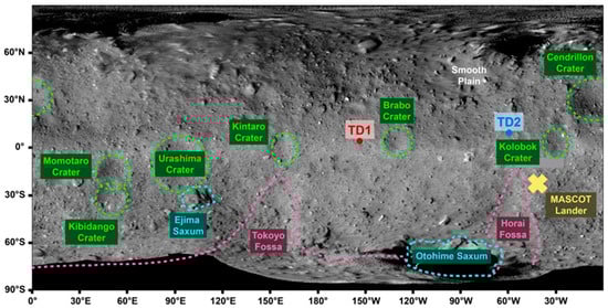 A map of Ryugu showing the key geological features and the touchdown sites from which the samples were located. TD1 = touchdown site 1 and TD2 = touchdown site 2. Credit for the background image belongs to the Japan Aerospace Exploration Agency (JAXA), University of Tokyo, Kochi University, Rikkyo University, Nagoya University, Chiba Institute of Technology, Meiji University, University of Aizu and National Institute of Advanced Industrial Science and Technology AIST. The key geological features were overlayed onto the map by consulting with the literature [].