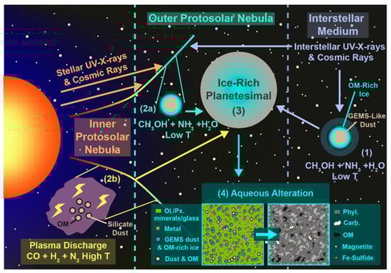 When the PSN/PSD enters into the protoplanetary disk phase, streaming instabilities or vortices cause dust, ice and any associated OM to coagulate to form cm-sized pebbles [,,]. The pebbles can then form larger bodies called planetesimals via either gravitational collapse [,] or hierarchical agglomeration [,]. Planetesimals are thought to heat up due to the decay of short-lived radio nuclides, such as 26Al, included in their rocky dust components []. As a result, the ice melts producing aqueous fluids rich in organic and volatile components, which react with the minerals comprising the dust to form phyllosilicates and other secondary phases, including sulfides, metal oxides and carbonates [,,]. During this period of aqueous alteration, a large array of different organic reactions can take place, potentially leading to the production of both the FOM/SOM and MOM/IOM found in carbonaceous chondrite meteorites [,,,].