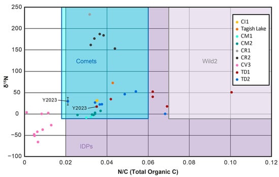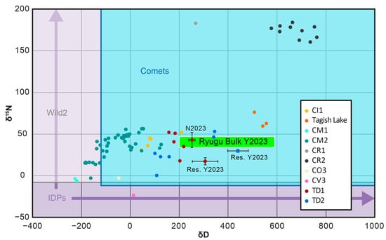When comparing the δ15N and δD values for the different studies of Ryugu [,,], it is apparent that all values overlap with those from bulk carbonaceous chondrites [], IDPs [], Wild2 cometary particles [] and comets [] (Figure 6). While the values for comets, Wild2 particles and IDPs extend to much higher values than those observed for the Ryugu particles, the overlap suggests that at least some of the OM in these extraterrestrial materials bears a resemblance to that in Ryugu.