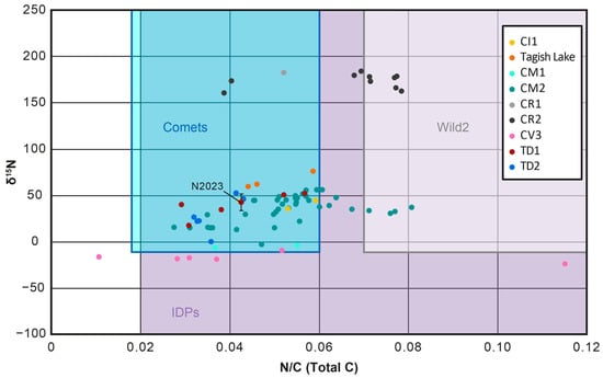 The N and H isotope composition among Solar System materials varies greatly [], with the δ15N and δD values for the Gas Giant Jupiter representing some of the lowest values in the solar system (δ15N = −374 ± 82‰ and δD = −833 ± 45‰) [,]. Interestingly, the values for Jupiter are similar to those proposed for the PSN (δ15N = −382 ± 8‰ and δD = −865 ± 32‰) obtained from solar wind values [,]. Meanwhile, some of the highest δ15N and δD values among solar system objects are recorded for carbonaceous chondrites (bulk δ15N = −23.7 to 359.7 and δD = −225.8 to 763.1) [,] and comets (δ15N = −10.8 to 2022.6 and δD = −120.5 to 641,000.0) [,]. While the δ15N and δD values of comets go up to much higher values than the bulk values from carbonaceous chondrites, there is significant overlap of the values between these two types of extraterrestrial objects at the lower end of the range for comets. To complicate the picture further, Wild2 cometary silicates from the Stardust mission record carbonaceous chondrite-like bulk δ15N values and also contain 15N-rich hotspots similar to those observed in carbonaceous chondrites [,].