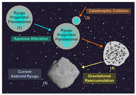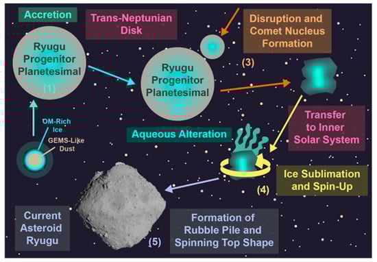 - Miura, H.; Nakamura, E.; Kunihiro, T. The Asteroid 162173 Ryugu: A Cometary Origin. Astrophys. J. Lett. 2022, 925, L15. [Google Scholar] [CrossRef]