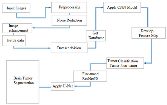 The model can be used for brain tumor segmentation. The result of the U-Net architecture is a probability map representing the likelihood of each pixel in the input image belonging to the tumor region. A threshold can be set on this map to obtain the binary segmentation map, which indicates the presence or absence of the tumor in each pixel of the input image. The binary segmentation map obtained from the U-Net can be used to improve the accuracy of the brain tumor detection and classification tasks performed by the CNN model with fine-tuned ResNet50. For example, the binary segmentation map can focus the proposed model’s attention on the tumor region, reducing false positives and improving the overall accuracy. To integrate the outputs from the CNN model with fine-tuned ResNet50 and the U-Net architecture, the binary segmentation map can be overlaid onto the input MRI image to highlight the tumor region.