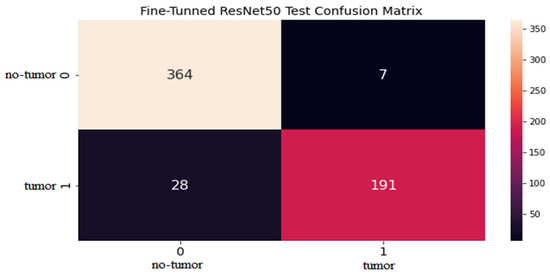 During training, the fine-tuned ResNet50 model with CNN learns to extract discriminative features from the MRI scans of the brain and classify them as tumor or healthy. The pre-trained ResNet50 model provides a robust initial set of features for brain tumor detection, and fine-tuning the model on a new dataset of MRI scans helps adapt it to the specific task at hand. This approach has achieved high accuracy for BT detection and classification using MRIs.