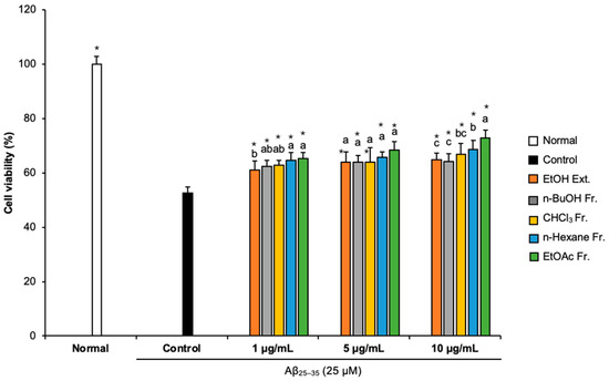 Effect of CJM flower extracts and fractions on cell viability in Aβ25–35-treated C6 glial cells. Values are means ± standard deviation. Ext., extract; Fr., fraction. a–c Means with different letters are significantly different (p < 0.05) via Duncan’s multiple range test among extract- and fraction-treated groups. Significant differences between the two groups are observed with Student’s t-test (* p < 0.001 vs. control). Aβ, Amyloid beta.
