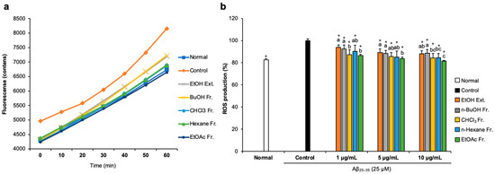 To examine whether FCJM possessed antioxidant activity in Aβ25–35-treated C6 glial cells, we measured ROS production by detecting 2′,7′-dichlorofluorescein. The fluorescence fluctuation of Aβ25–35-treated C6 glial cells was monitored for 60 min (Figure 2a). After treatment with DCF-DA, fluorescence showed a time-dependent tendency in all groups. Notably, Aβ25–35-treated C6 glial cells showed higher fluorescence counts, which indicated that the ROS level increased due to Aβ25–35 compared to the normal cells. In contrast, treatment with FCJM extracts and fractions showed a time-dependent inhibition in ROS production. Figure 2b presents the fluorescence counts at 60 min. The ROS production was significantly inhibited by EFCJM, which was the most effective material among the other extract and fractions (p < 0.001 vs. control). Therefore, these results suggested that FCJM, especially EFCJM, had protective effects on oxidative damage induced by Aβ25–35, leading to the inhibition of ROS production.
