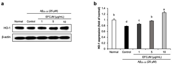 To ascertain how FCJM modulates neuroprotective effects, we chose EFCJM, the most effective fraction among the others, and performed Western blotting. We evaluated whether EFCJM regulated HO-1 expression level in Aβ25–35- treated C6 glial cells (Figure 3). Our results showed that treatment with Aβ25–35 decreased HO-1 expression level compared with that in normal cells. In contrast, treatment with EFCJM dose-dependently increased the HO-1 expression level. These results suggested that EFCJM treatment showed a protective effect on oxidative stress by regulating the HO-1 expression level in Aβ25–35-treated C6 glial cells.
