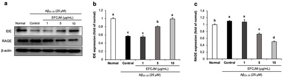 Effects of the ethyl acetate fraction of EFCJM on protein levels of IDE and RAGE in C6 glial cells treated with Aβ25–35. (a) Bands of IDE and RAGE protein expression. (b) IDE protein expression level. (c) RAGE protein expression level. Values are mean ± standard deviation. a–d Means with different letters are significantly different (p < 0.05), as determined via Duncan’s multiple range test. RAGE, IDE.