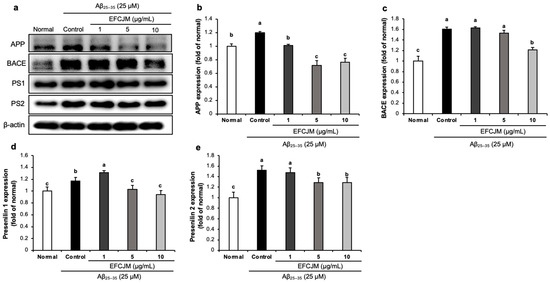Figure 6 presents the expressions of amyloidogenic pathway-related proteins and the ameliorating effects of EFCJM treatment for each concentration in Aβ25–35-treated cells. The expression levels of APP, BACE, PS1, and PS2 were significantly higher in Aβ25–35-treated cells than in untreated normal cells. Compared with the EFCJM treated groups, the expressions of APP, BACE, PS1, and PS2 proteins were decreased (1, 5, 10 μg/mL). These results suggested that EFCJM treatment ameliorated Aβ production by modulating amyloidogenic pathway-related proteins.