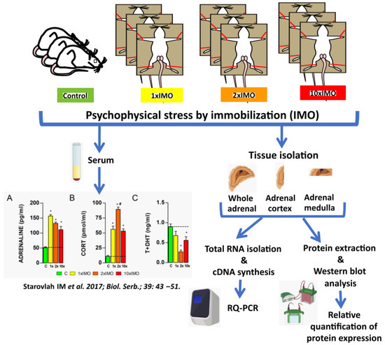 Adult, three-month-old male Wistar rats were used in all the experiments. All the animals were bred and raised in the accredited Animal Facility of the Faculty of Sciences, University of Novi Sad, Serbia. The Animal Facility provided controlled environmental conditions (22 ± 2 °C; 14 h light and 10 h dark cycle; lights on at 07:00 AM) with food and water available ad libitum. The experimental model of psychophysical stress by immobilization (IMO) was performed using the method of Kvetnansky [21] with some modifications previously described by our group [18,19] (Figure 1). Briefly, stressed (IMO) rats were bound in a supine position to a wooden board by fixing the rats’ limbs using thread, while the head motion was not limited. In each experiment, unstressed, freely moving animals were used as a control group. To analyze the effect of psychophysical stress, animals were subjected to immobilization stress once (1 × IMO) for two hours, or repeatedly for two (2 × IMO) and ten (10 × IMO) consecutive days, in the duration of two hours at the same period during the day (from 07:00 AM to 9:00 AM). At the end of the experimental period, control and stressed animals were quickly decapitated without anesthesia, and adrenal glands were isolated. In each experiment, the control and experimental group consisted of four animals. The experiments were repeated twice.