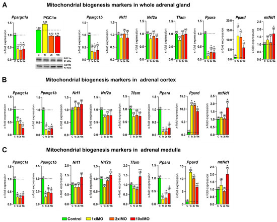 Transcriptional profiles of mitochondrial biogenesis markers in the whole adrenal gland, adrenal cortex, and medulla tissues after one, two, and ten times repeated psychophysical stress of the entire organism. Whole adrenal gland tissue (A) as well as the adrenal cortex (B) and medulla (C) tissues were isolated from undisturbed rats, as well as acutely (1 × IMO), and repeatedly (2 × IMO and 10 × IMO) stressed rats. Tissue was further used for RNA isolation followed by the analysis of the transcriptional profile of mitochondrial biogenesis markers. Whole adrenal gland tissue was used for PGC1 protein expression analysis. The representative blots are shown as panels. Data from scanning densitometry were normalized to ACTIN (endogenous control). Values are shown as bars above the photos of blots. The data bars represent mean ± SEM values of two independent in vivo experiments (number in brackets above the bars represents number of analyzed animals). Statistical significance was set at level p < 0.05: * vs. control group and # vs. 1 × IMO group.
