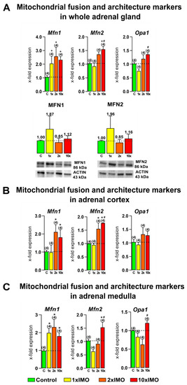 In order to understand the connection between stress and mitochondrial dynamics markers in the adrenal gland, an immobilization stress (IMO) period of 2 h was applied to the adult male rats once (1 × IMO) as an acute stress, or for two (2 × IMO) and ten (10 × IMO) consecutive days as a repeated stress [18,19]. After the immobilization period, the transcriptional profiles of mitochondrial dynamic markers were obtained in the whole adrenal gland tissue, as well as the adrenal cortex and adrenal medulla tissues. In addition, the expression of the proteins involved in the maintenance and regulation of mitochondrial dynamics were studied.