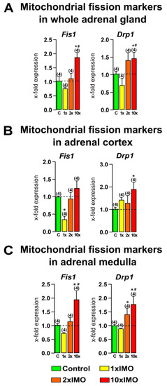 Different transcriptional profiles of mitochondrial fission markers in the whole adrenal gland, adrenal cortex, and medulla tissues after one, two, and ten times repeated psychophysical stress of the entire organism. Whole adrenal gland tissue (A), as well as the adrenal cortex (B) and medulla (C) tissues, were isolated from undisturbed rats, as well as acutely (1 × IMO) and repeatedly (2 × IMO and 10 × IMO) stressed rats. Tissue was further used for RNA isolation followed by an analysis of the transcriptional profile of mitochondrial fission markers. The data bars represent mean ± SEM values of two independent, in vivo experiments (number in brackets above the bars represents number of analyzed animals). Statistical significance was set at level of p < 0.05: * vs. control group and # vs. 1 × IMO group.