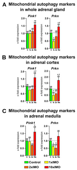 Acute and repeated psychophysical stress of the entire organism changed transcriptional profiles of mitochondrial autophagy markers in the whole adrenal gland, adrenal cortex, and medulla tissues. Whole adrenal gland (A) tissue, as well as adrenal cortex (B) and medulla (C) tissues, were isolated from undisturbed rats, as well as acutely (1 × IMO) and repeatedly (2 × IMO and 10 × IMO) stressed rats. Tissue was further used for RNA isolation followed by an analysis of the transcriptional profile of mitochondrial autophagy markers. The data bars represent mean ± SEM values of two independent, in vivo experiments (number in brackets above the bars represents number of analyzed animals). Statistical significance was set at level of p < 0.05: * vs. control group and # vs. 1 × IMO group.